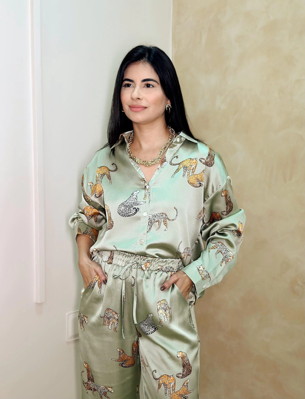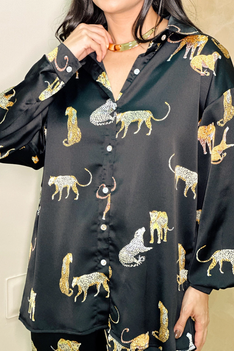 Blusa mangas longas modelagem solta, fechamento frontal de botões, gola tradicional com lapelas, mangas longas com punhos e fechamento em botão.