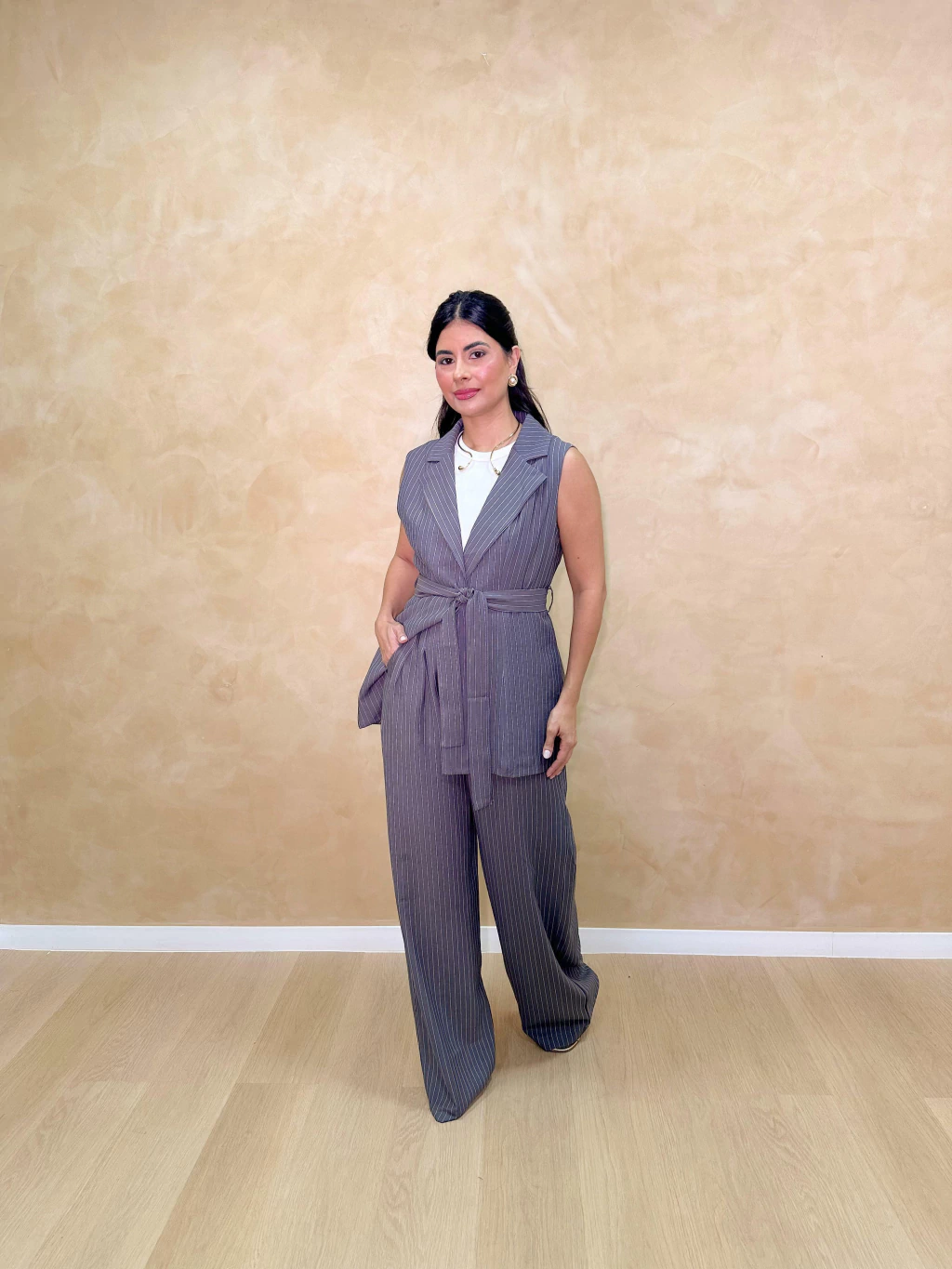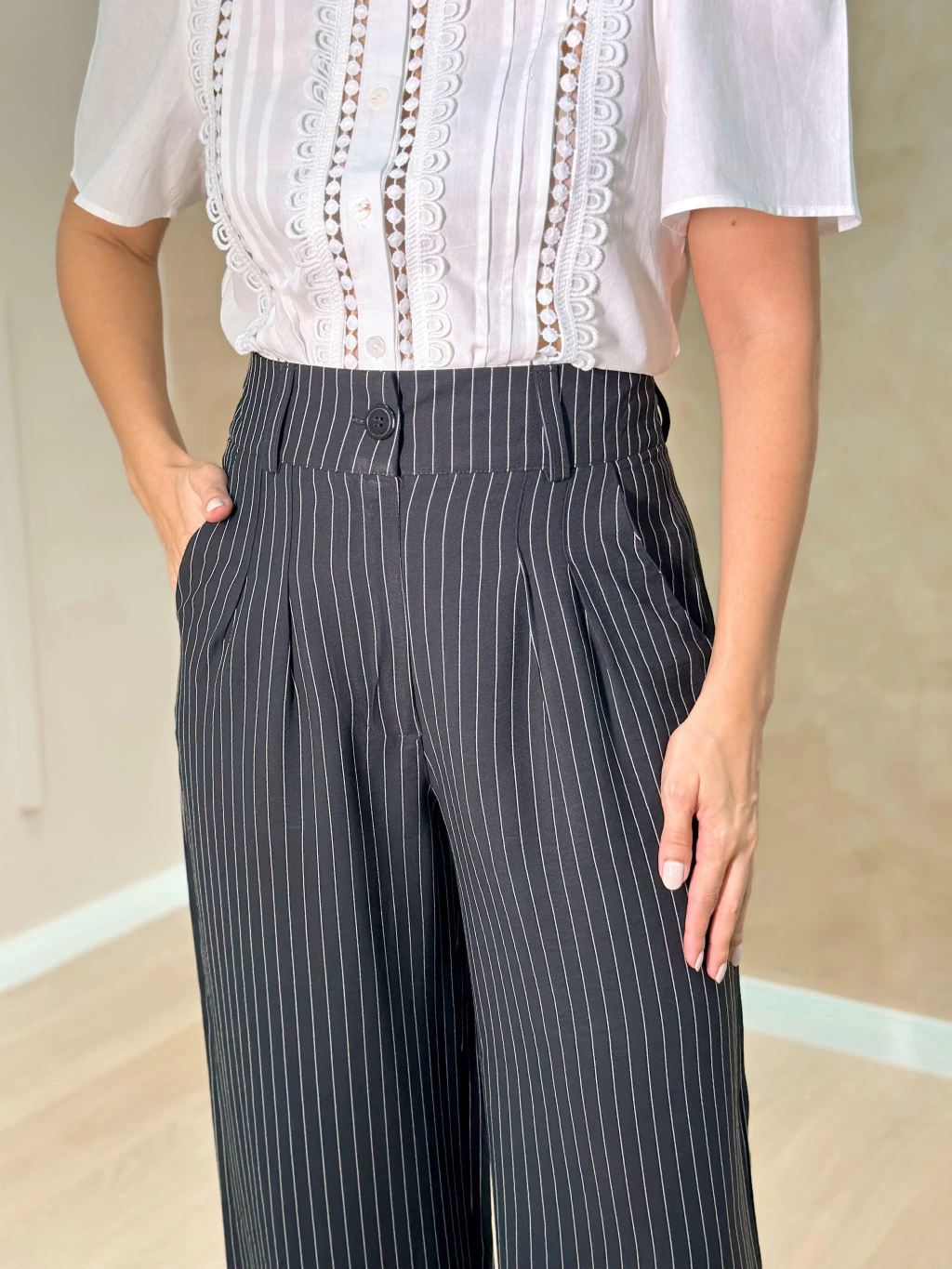 Calça modelagem reta e ampla, com caimento solto e sofisticado, listras finas vesticais, alongando a silhueta, possui cós cintura alta, com cós bem ajustado com passantes para cinto, detalhes de pregas frontais que deixam o caimento mais elegante.