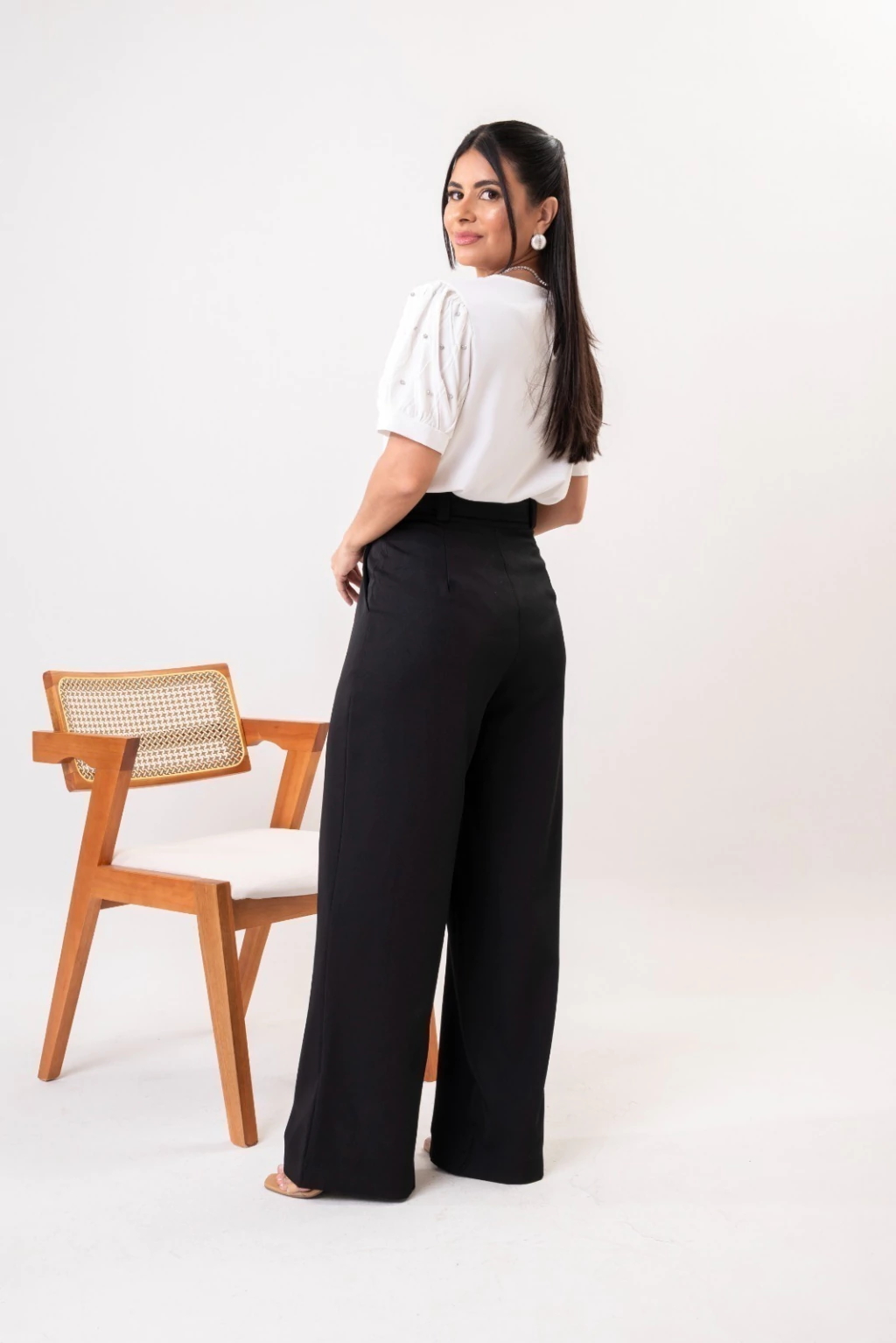 Calça possui modelagem wide leg com pernas amplas, que trazem conforto e alongam a silhueta, conta com cintura alta, cinto faixa para amarração que valoriza a região da cintura, além de pregas frontais sutis que garantem um caimento impecável. O cós estruturado dá mais firmeza à peça, enquanto os bolsos laterais agrega praticidade.