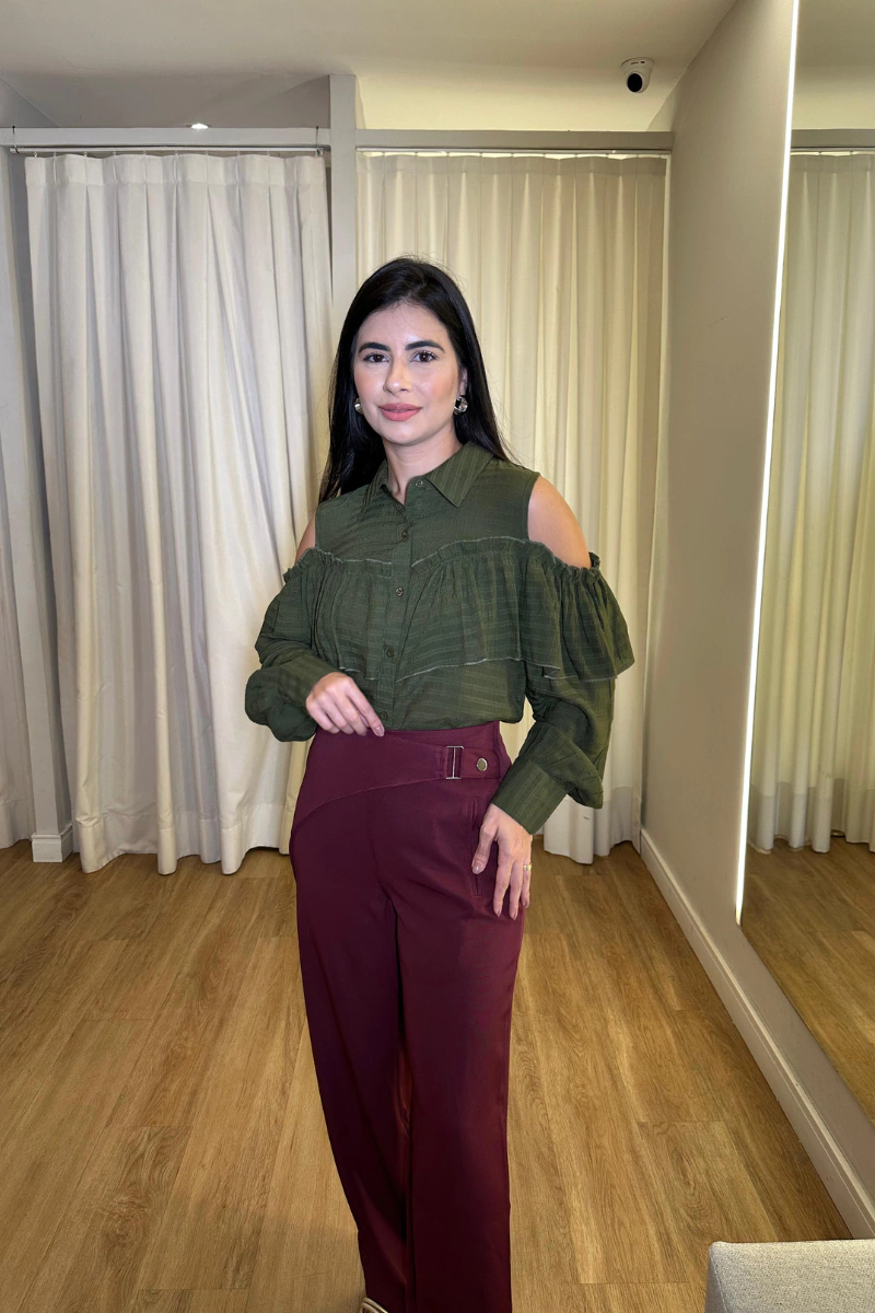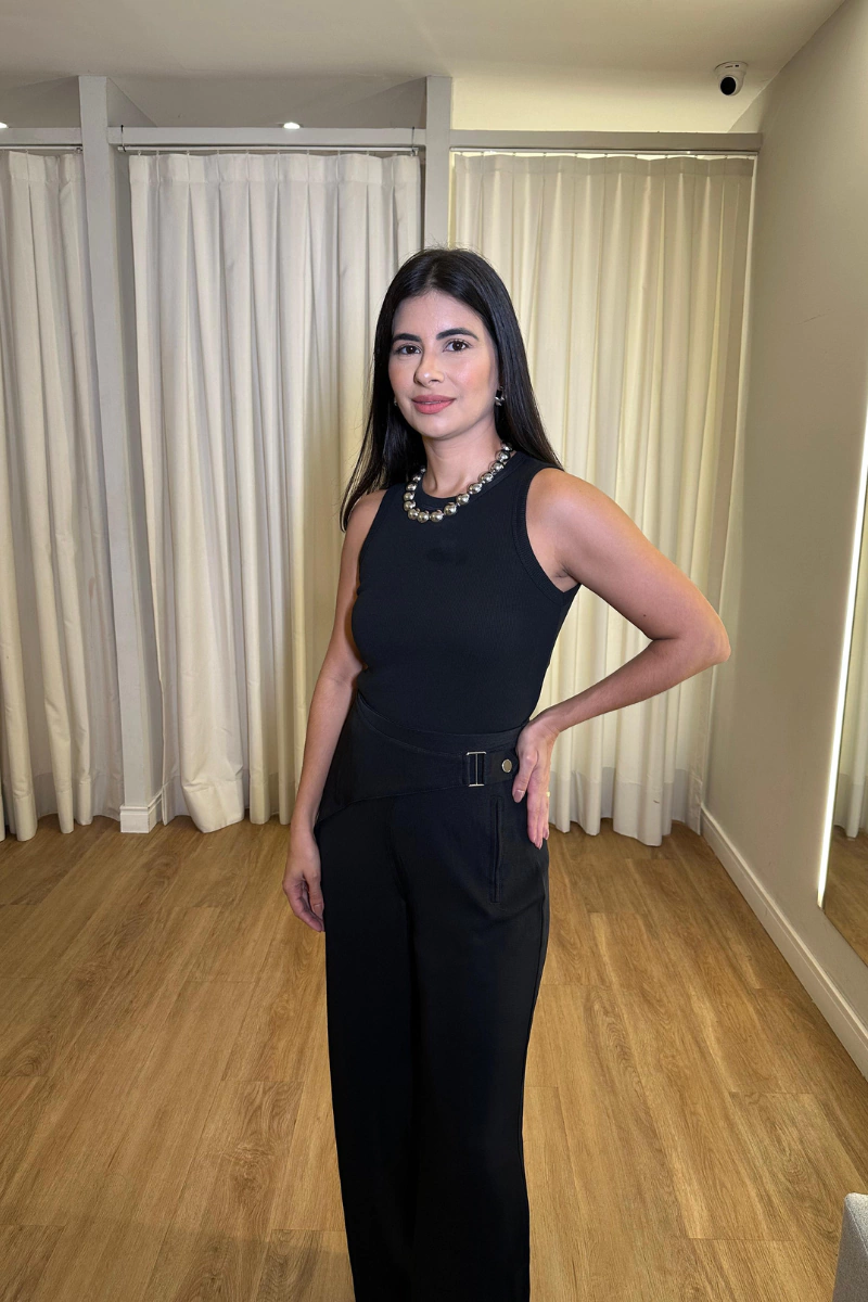 Calça de alfaiataria de cintura alta, com corte reto e caimento elegante. detalhe uma faixa assimétrica na cintura, com botão metálico decorativo no lado direito, criando um visual moderno e diferenciado.