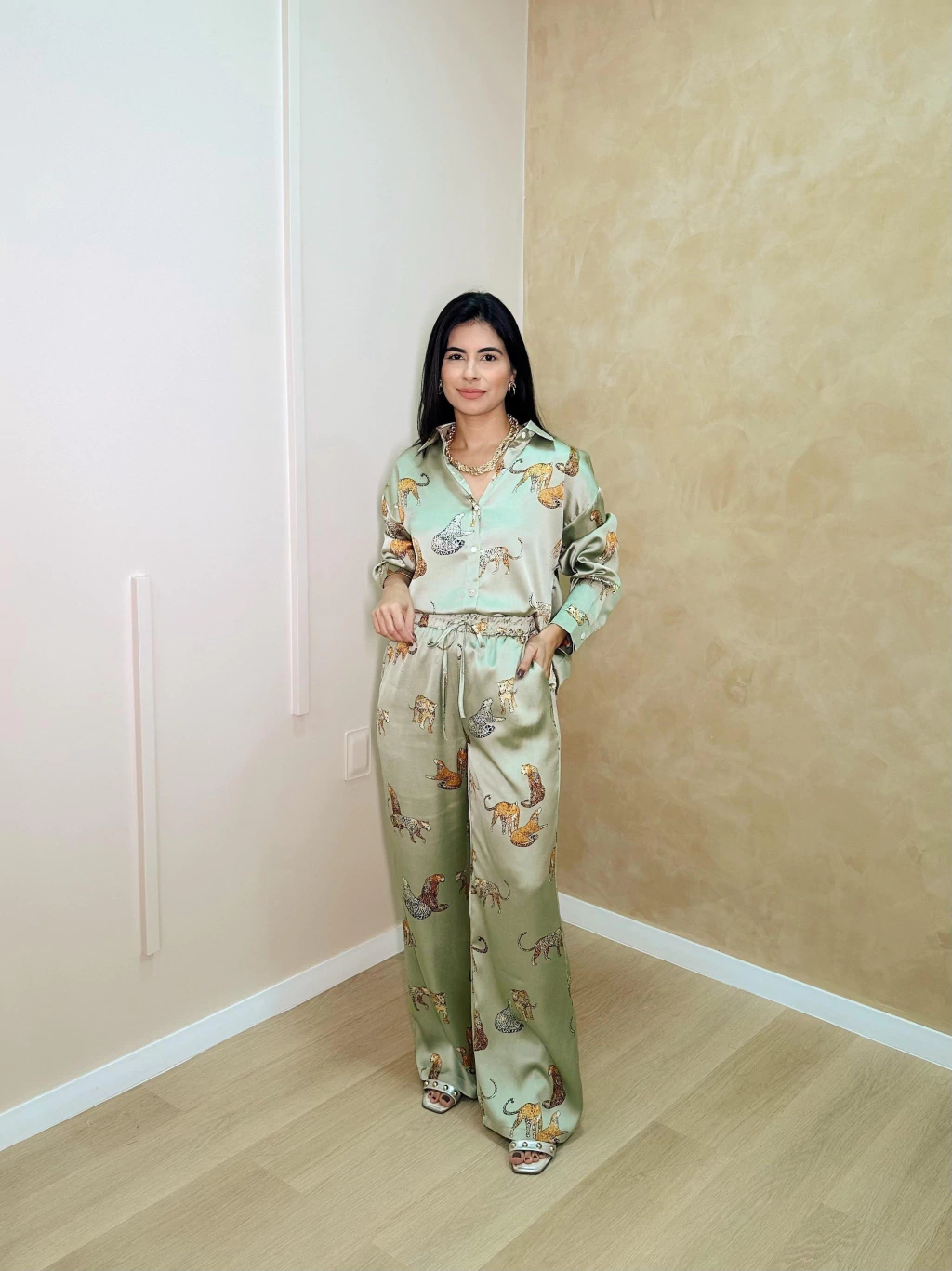Calça modelagem reta com pernas amplas e comprimento longo, cintura alta com cós de elástico embutido, oferecendo ajuste confortável e versátil.