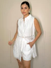 O shorts na mesma cor e tecido liso que a parte superior da blusa.