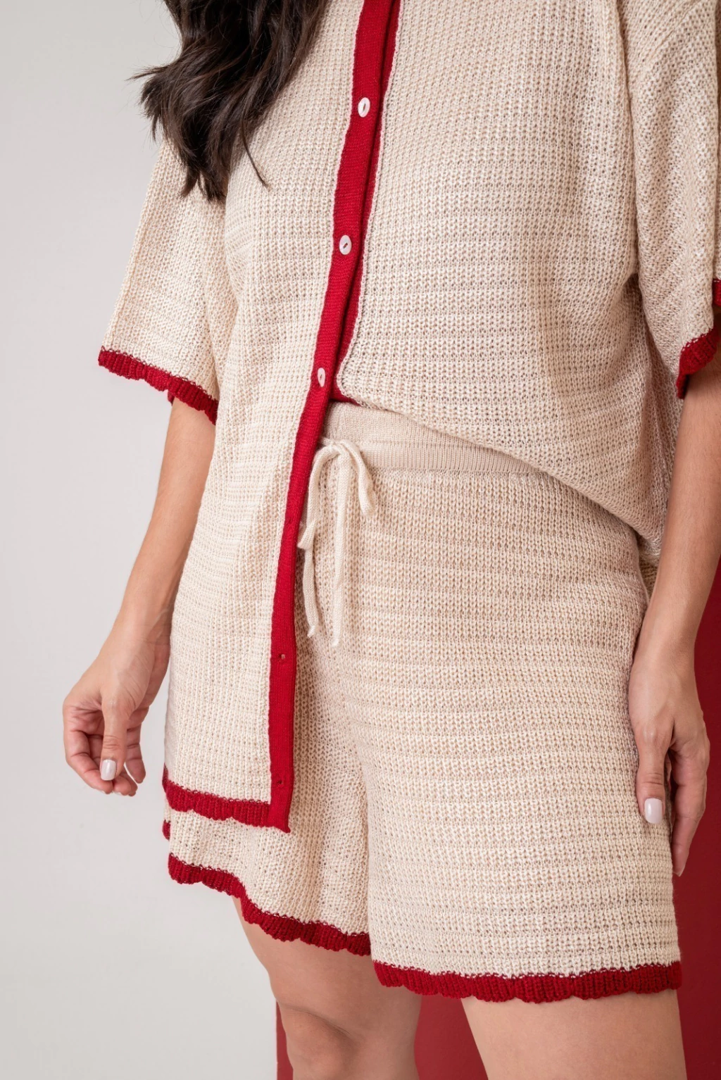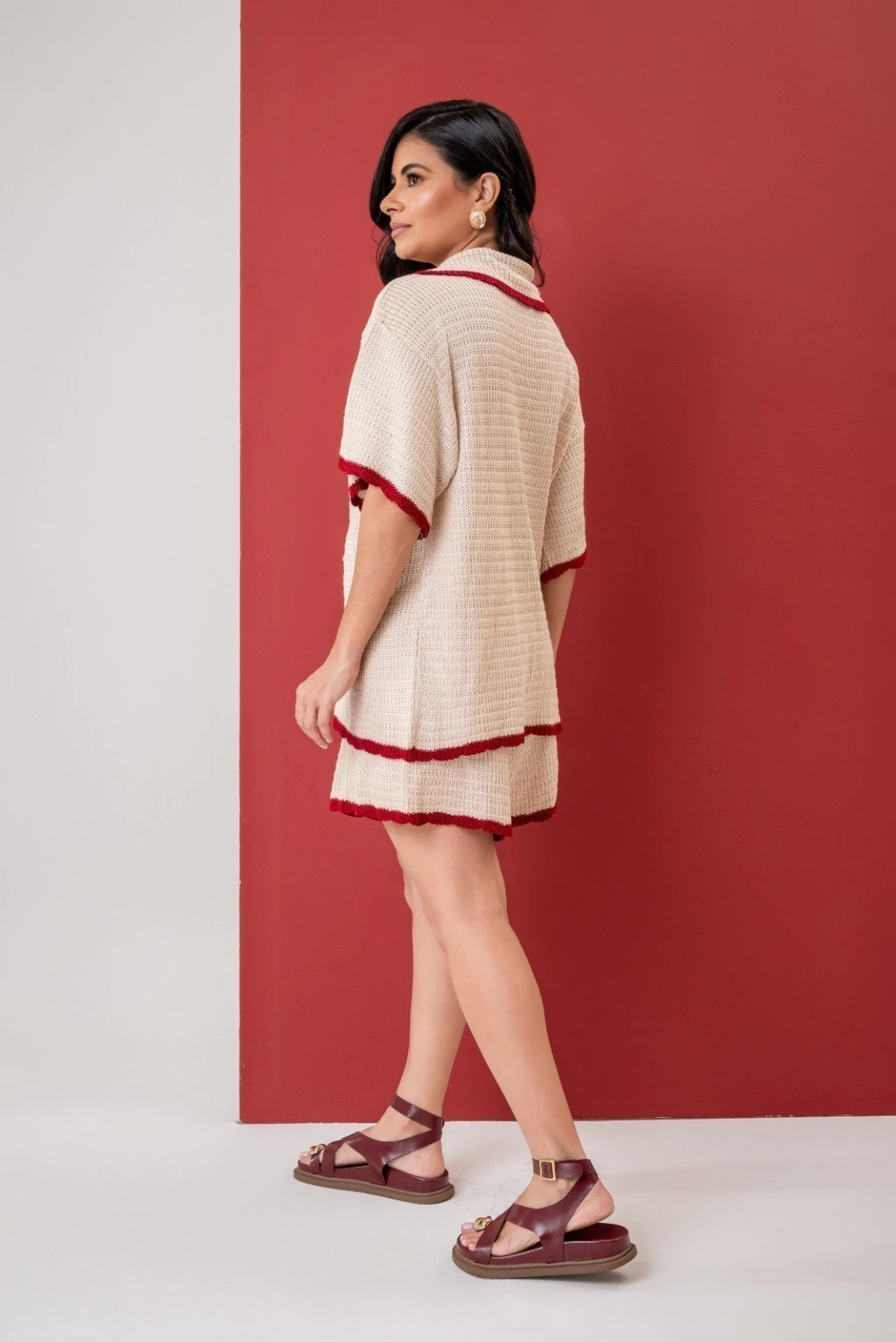 Short curto tem cós elástico com cordão de ajuste na mesma cor do tricô, a modelagem é solta e confortável.