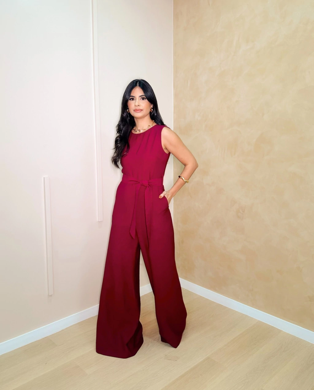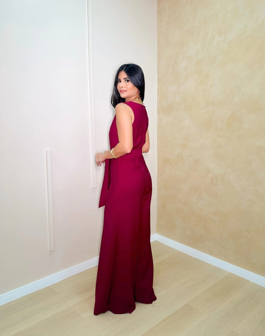 Macacão longo, com pernas amplas e soltas (estilo pantalona), o que confere leveza e movimento ao look.