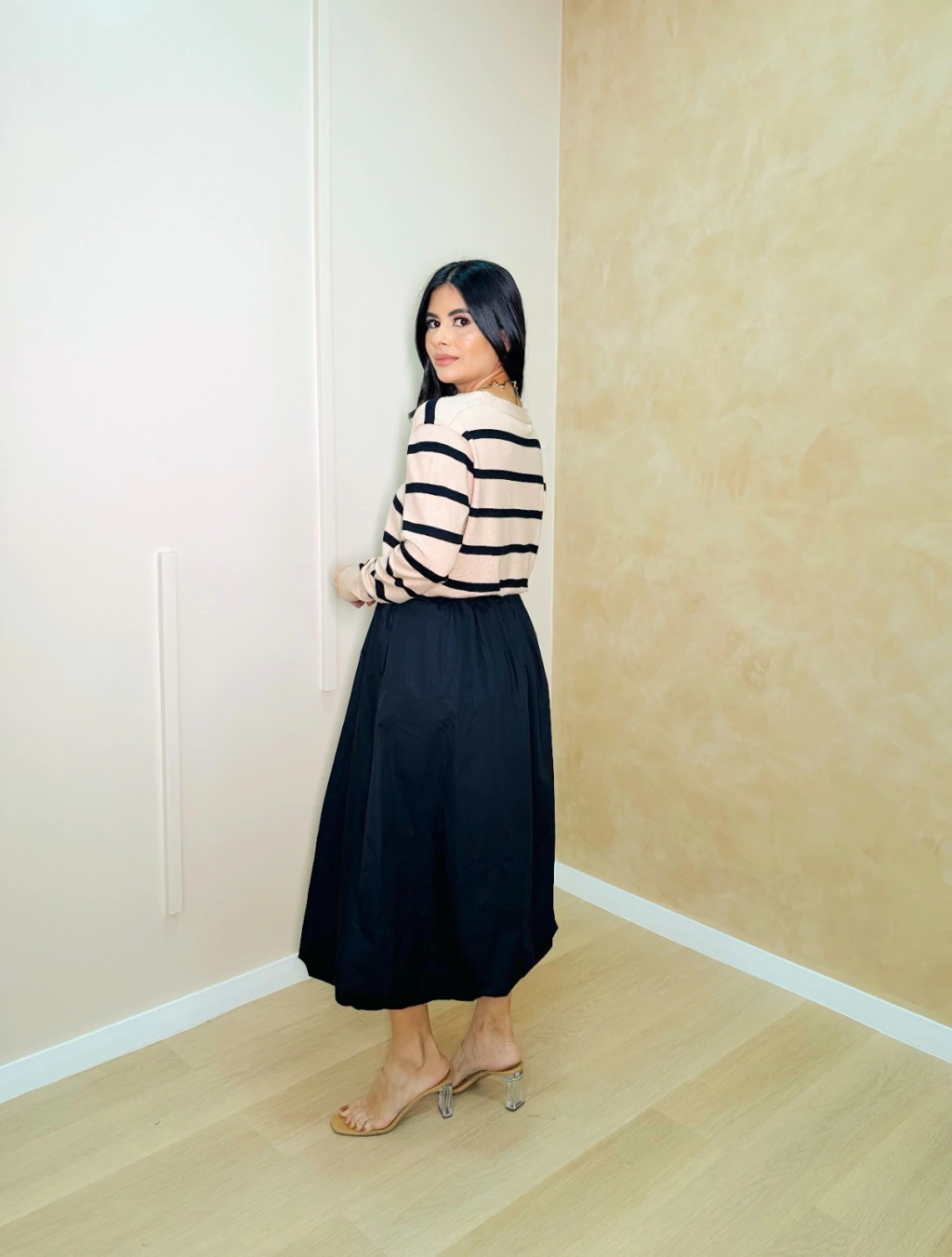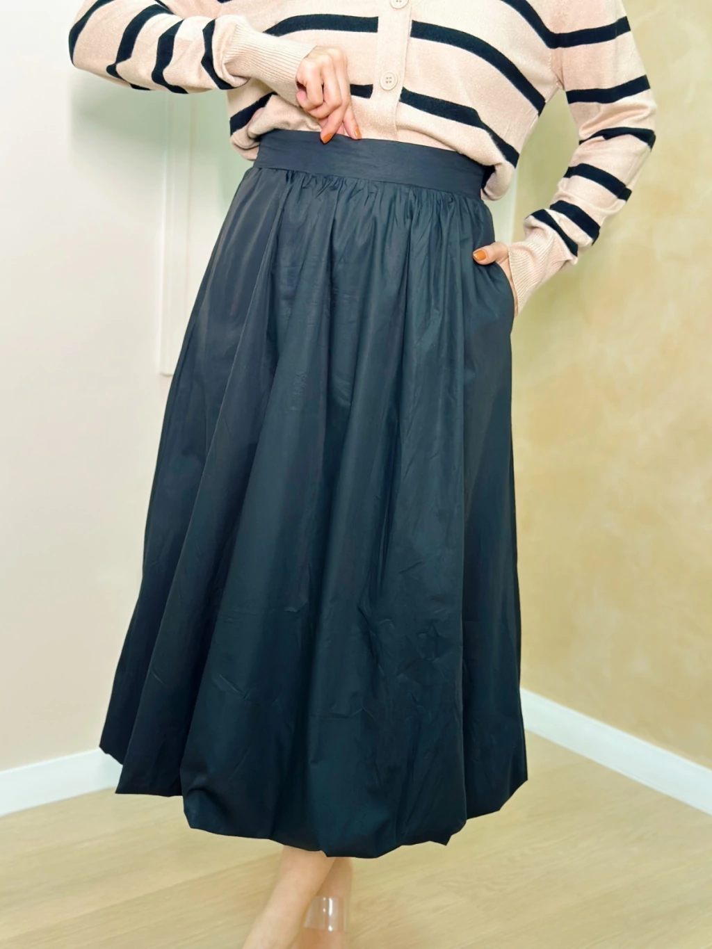 Saia midi combina elegância e conforto em um design atemporal, saia balonê cintura alta, ela valoriza a silhueta de forma sutil.