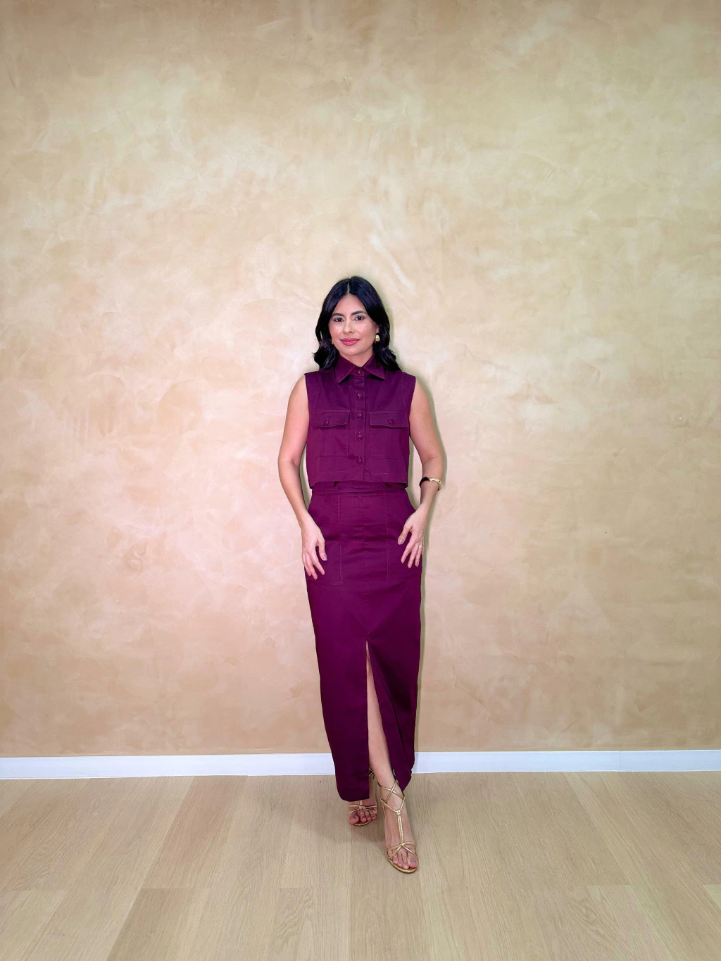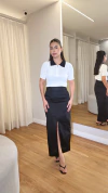 Saia modelagem reta e elegante, cintura alta fehamento por zíper na parte de trás, bolsos lateais fucionais, além de fenda central que garante sofisticação e mobilidade.