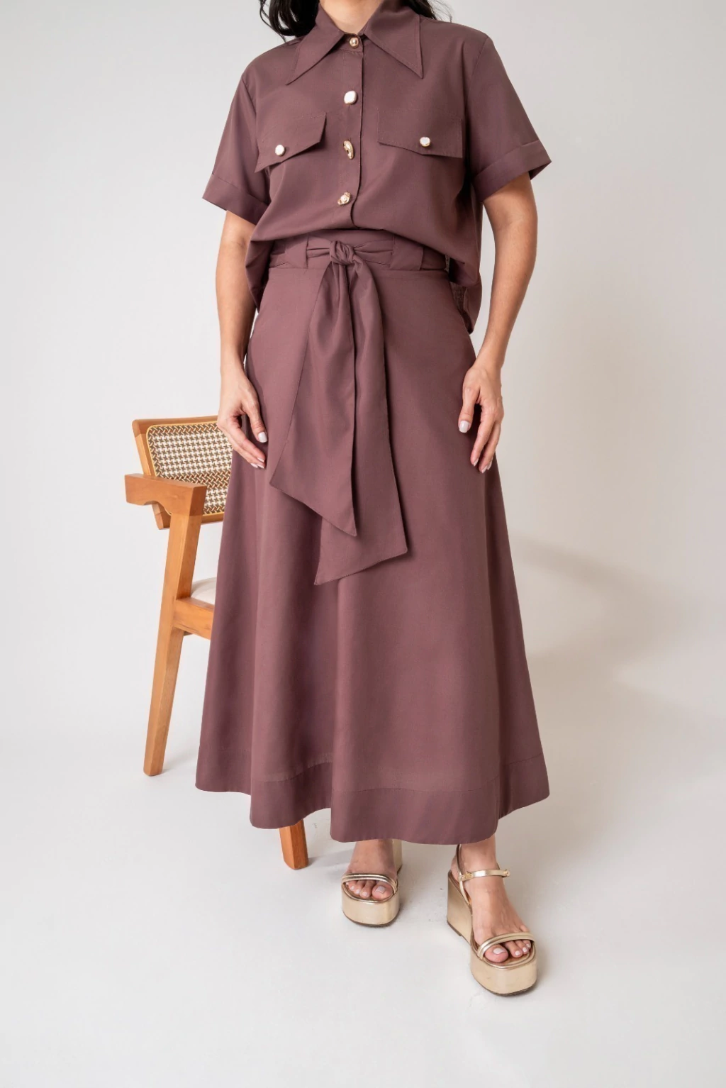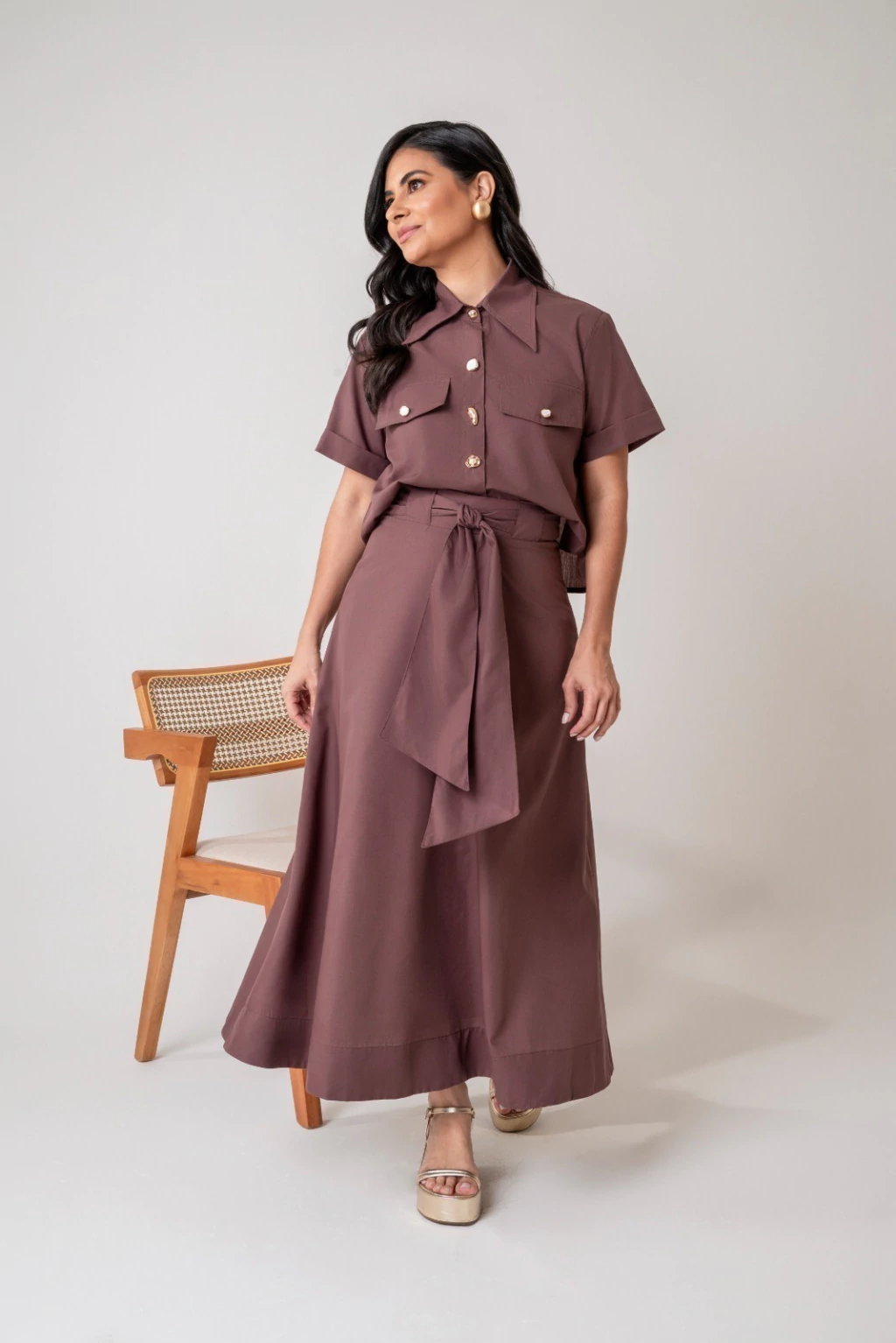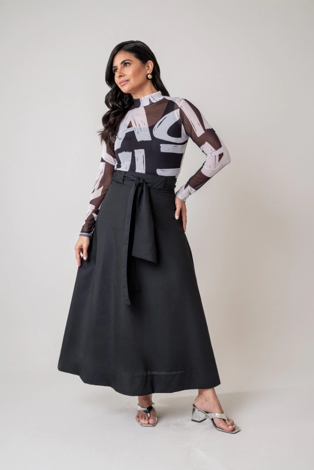 Saia midi preta de cintura alta, com cós largo e faixa amarrável no mesmo tecido. Possui um corte evasê ou amplo, que confere bom caimento e movimento à peça.