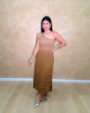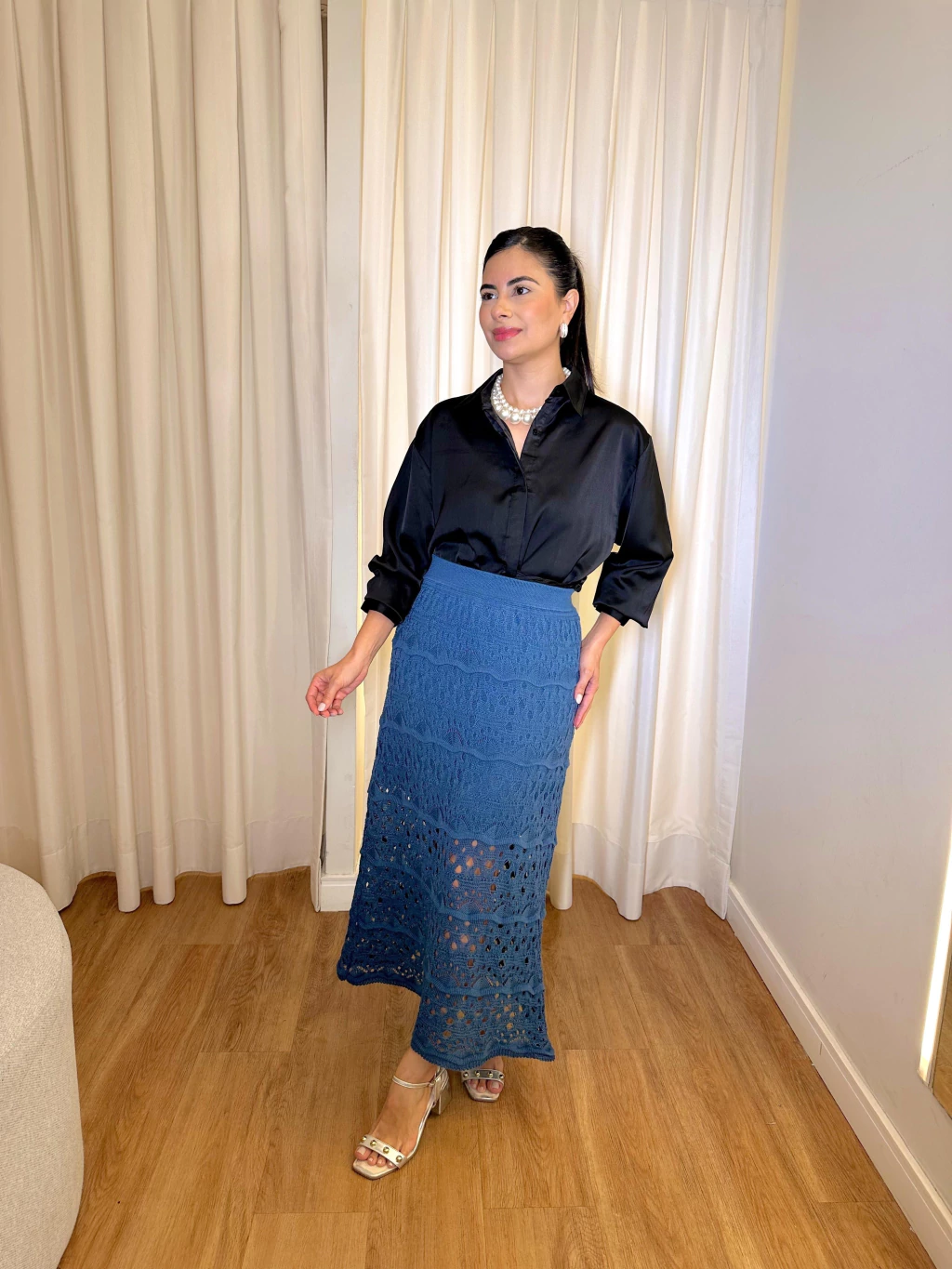 Saia midi de tricô com estilo artesanal pontos abertos e formato zigue-zague, com barra ondulada dando movimento e charme. Cós com elástico para melhor ajuste, e forro no mesmo tecido da peça.
