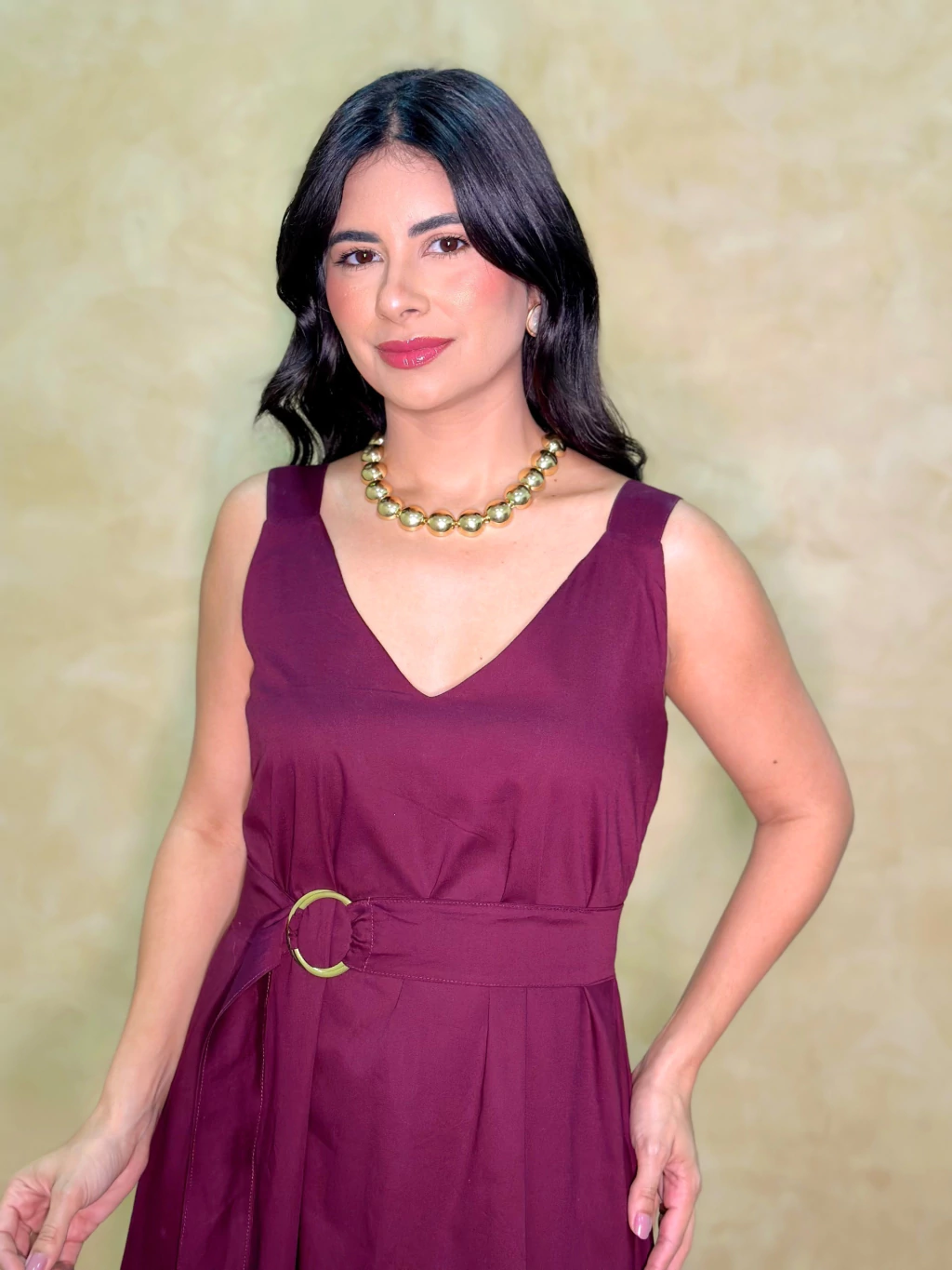 Vestido midi bicolor sem mangas, decote em "V" valorzando o colo, possui um cinto opcional, no mesmo tecido com fivela metálica redonda, que adiciona um toque sofisticado. Saia ampla e fluida, com recorte na barra em cor contrastante.