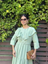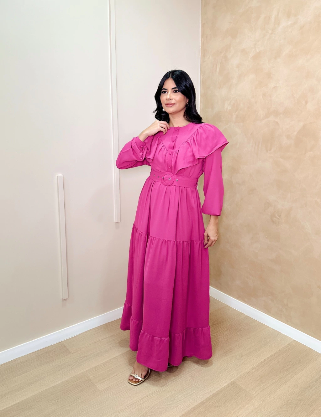Vestido longo com design elegante e romântico. A peça apresenta mangas longas com punhos levemente amplos e decote redondo. O destaque fica por conta da pala frontal com babados, que adiciona charme e feminilidade ao visual. Possui fechamento frontal com botões encapados no mesmo tecido do vestido e zíper invisivel na costa. Além de uma faixa com cinto forrado e fivela redonda, marcando a cintura com delicadeza. A saia é fluida, com recorte franzidos em camadas que proporcionam movimento e leveza à peça.