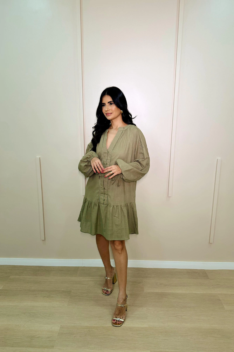 Decote V com detalhe de gola leve e pequena, possui aplicações de entremeios vazados ao longo da frente, nas mangas e do corte da saia, conferindo um toque artesanal e sofisticado.